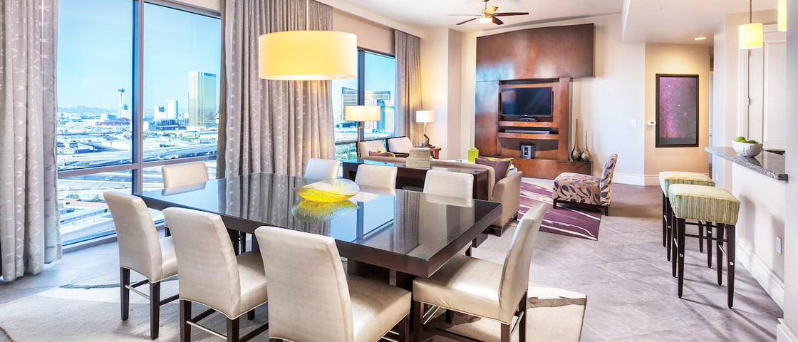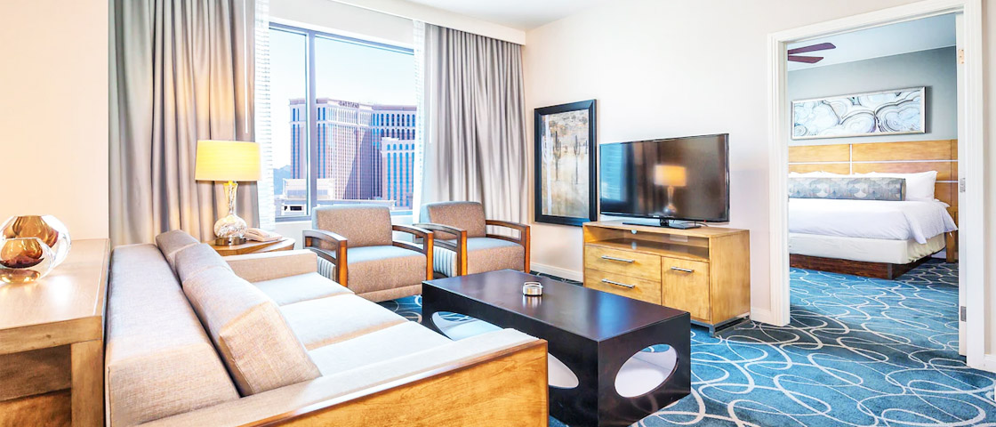 This spacious one-bedroom suite features a king bed & a queen sleeper sofa, plus a full kitchen with a refrigerator, stove, microwave, & dishwasher. Enjoy free Wi‑Fi, flat-screen TVs, in-room washer/dryer, & a private bath with premium amenities. Ideal for families or small groups, with select units offering Strip or desert views.