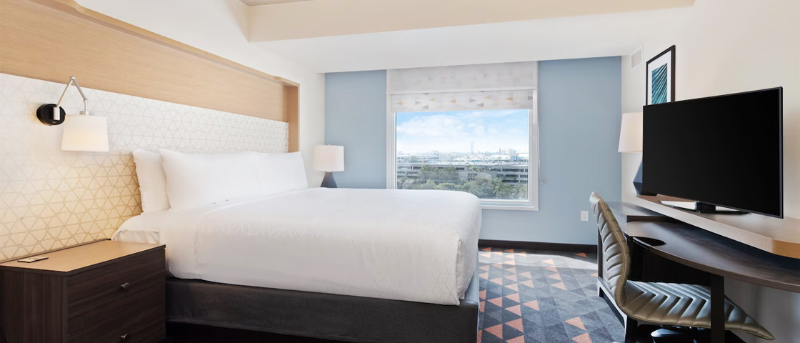 Holiday Inn & Suites Across From Universal Orlando offers a variety of accommodations to suit different guest needs. Standard rooms feature either two double beds or a king bed, all equipped with modern amenities such as a Keurig coffee maker, mini-refrigerator, and flat-screen TV. For those seeking more space, one-bedroom suites provide a separate living ar... Show More