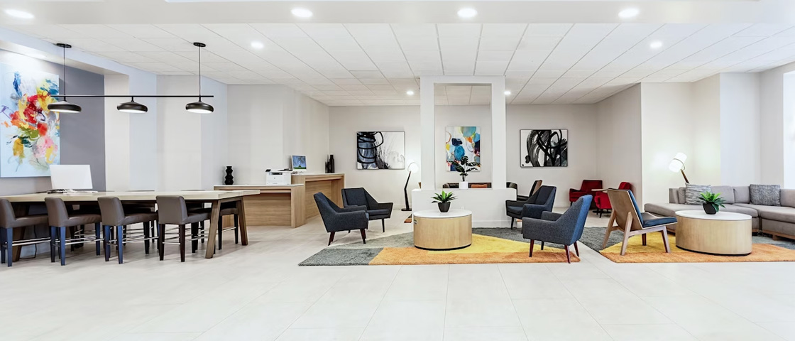 Accommodations at the hotel are spacious and modern, with a choice of standard rooms and large suites perfect for families and groups. Each room includes comfortable bedding, flat-screen TVs, mini-refrigerators, coffee makers, and free high-speed Wi-Fi. Suites provide extra space with separate living areas, giving guests the perfect blend of comfort and convenience. For business travelers, in-room workspaces and on-site meeting facilities ensure productivity while away from the office.