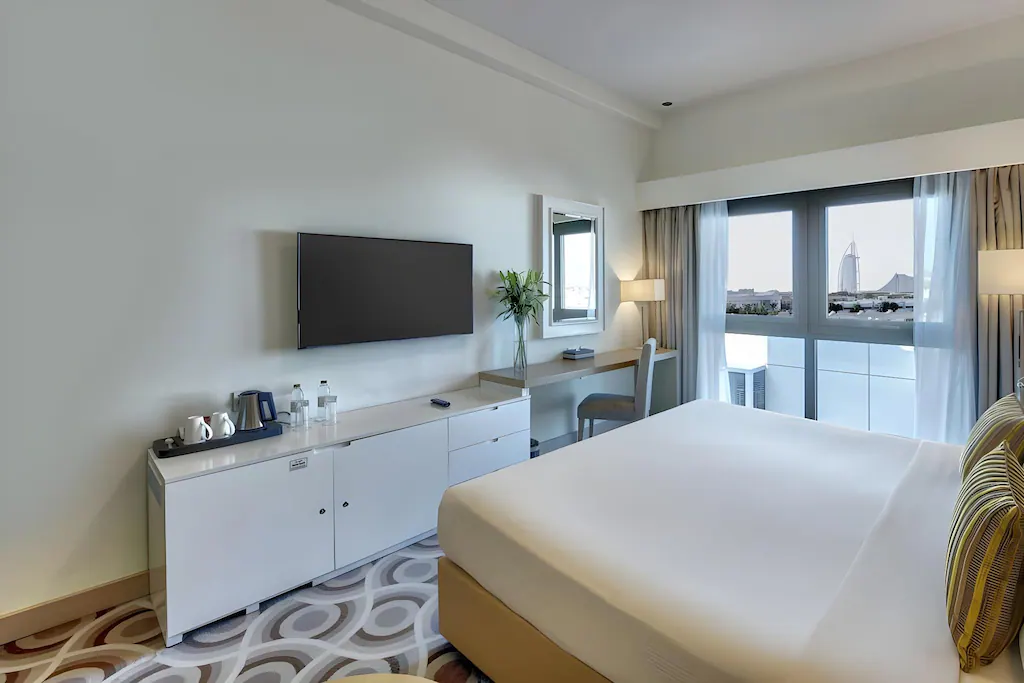 Your room is made for “rest up, then go again.” Expect a bright, modern space with a king or twin beds, strong A/C, a 42” flat-screen TV, and a tea/coffee setup for easy mornings. Many rooms also come with great city views - so even your downtime still feels like Dubai.